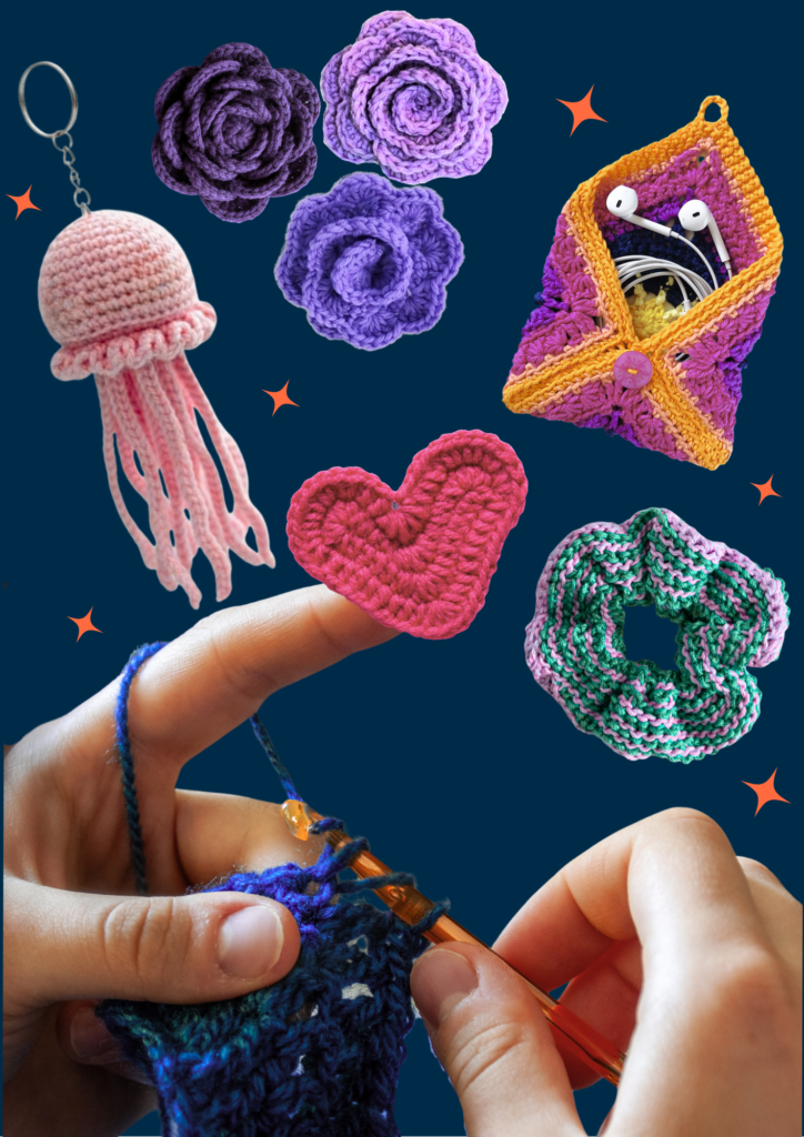 Handarbeit ist Widerstand! Wir häkeln uns ein politisches Statement gegen Gewalt, Massenkonsum und andere Vibe-Killer. Petya bringt euch ein postapokalyptisches Grundskill bei an einfachen Basics: Rose, Scrunchie, Taschencharm, Kopfhörer-Etui.